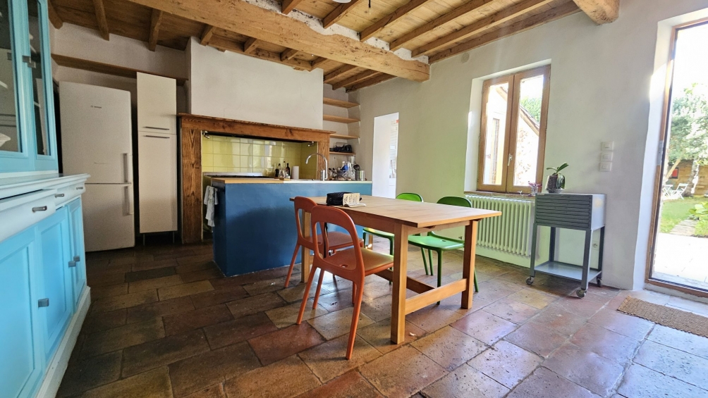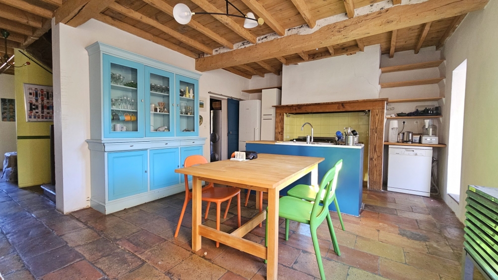 The main house opens onto a hallway with storage space, leading to the living room with an open fireplace. The kitchen and pantry give access to the garden terrace. The terracotta tiles have been preserved and the beams have been lightened.