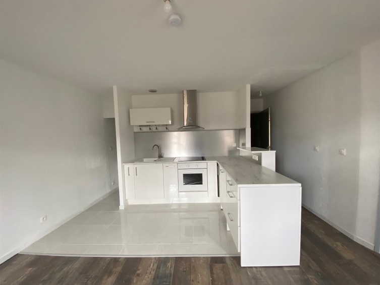 - a living room with a fitted kitchen equipped with cupboards, hob, extractor hood and oven (no fridge)