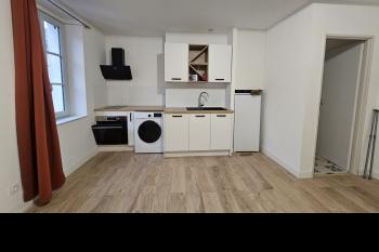 Located on the 1st floor of a building in downtown Rabastens. A kitchen with cupboards, hood, oven, and stove adjacent to a bright living room, a bathroom with single sink and cabinet, separate toilet, and 1 bedroom.
