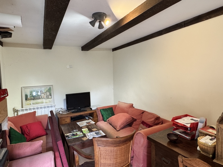 La cuisine/salle à manger (18 m²) est carrelée et équipée, d'une cuisinière à gaz avec four électrique et d'un lave-vaisselle. Des marches mènent des deux côtés au hall d'entrée et au salon (25 m²) avec parquet et sol en pierre, poêle à bois, évier ancien et portes-fenêtres donnant sur l'extérieur. Escalier menant au premier étage.