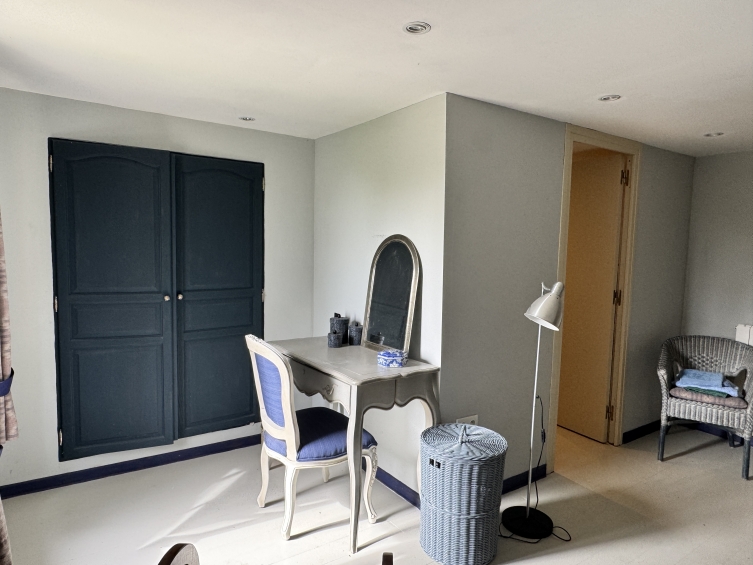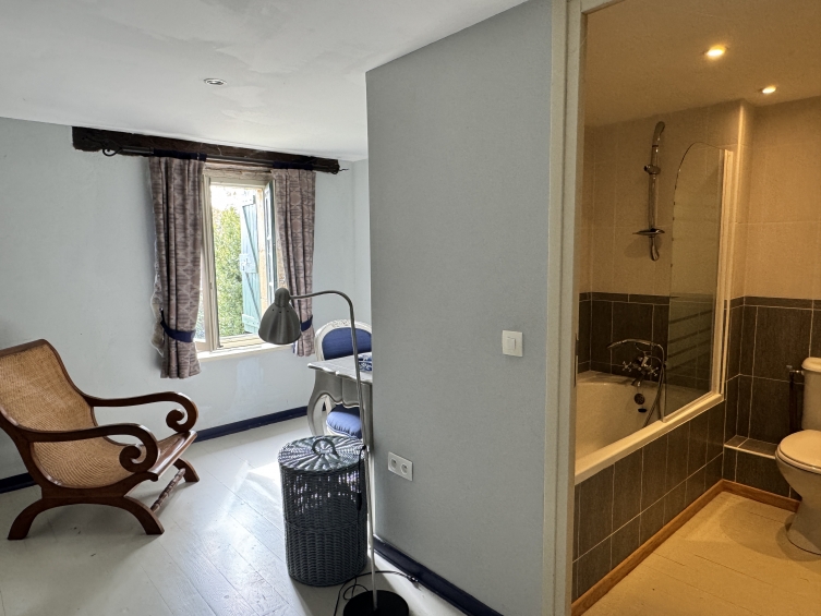 Depuis le salon, un escalier mène à un autre palier et à deux suites. La suite 3 dispose d'un dressing (13 m²) avec radiateur et spots encastrés, ainsi que d'une salle de bains attenante avec baignoire et douche, WC et lavabo. Escalier menant à la chambre (9 m² min) avec Velux dans le toit mansardé et radiateur. La suite 4 dispose également d'un dressing (16 m²) avec salle de bains attenante avec baignoire et douche, WC et lavabo, murs partiellement carrelés. Escalier menant à la chambre (10 m²) avec fenêtre Velux et radiateur.