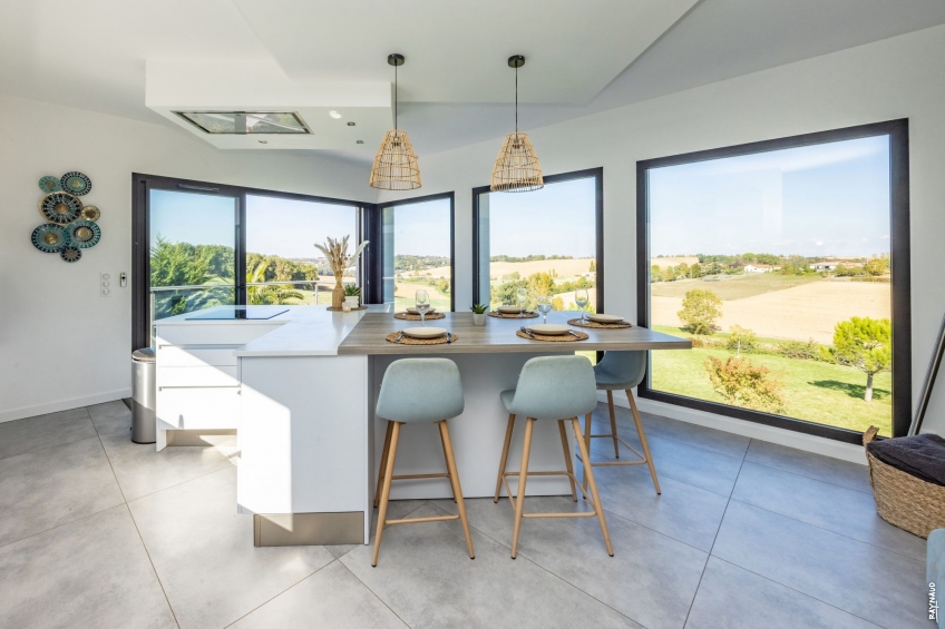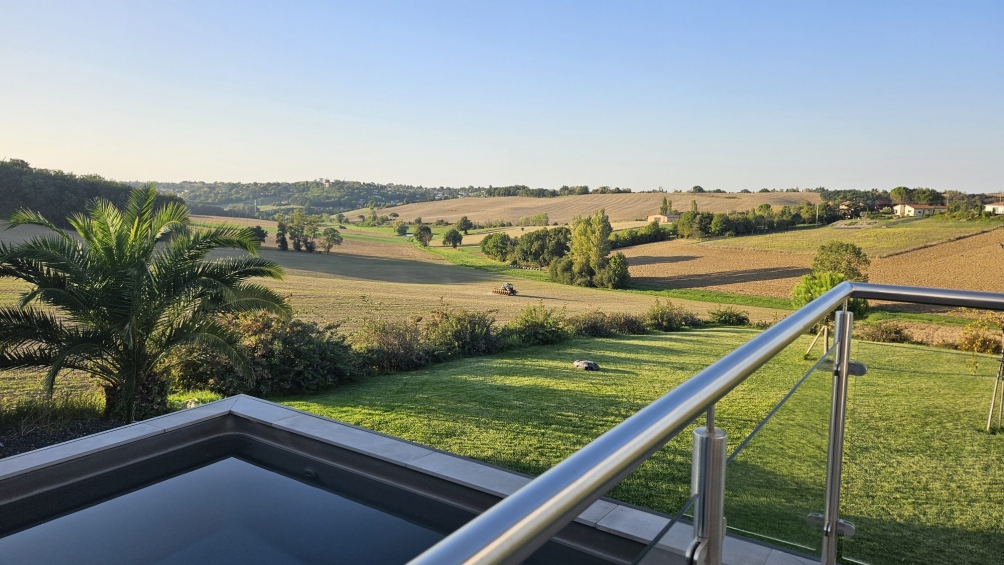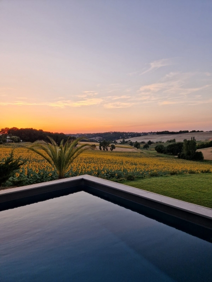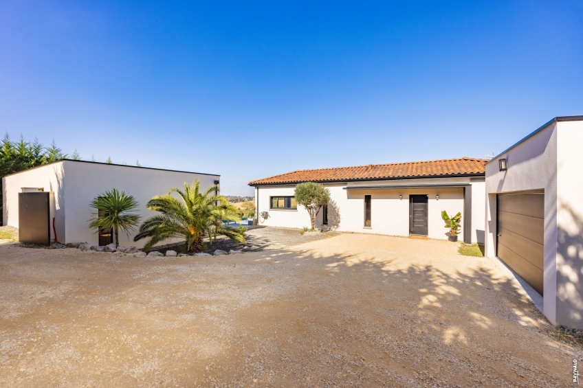 Dans les environs de Montastruc la Conseillère, une maison, que dis-je, un ensemble immobilier contemporain en position dominante avec vue imprenable sur la vallée et plus loin les coteaux, les villages alentour.