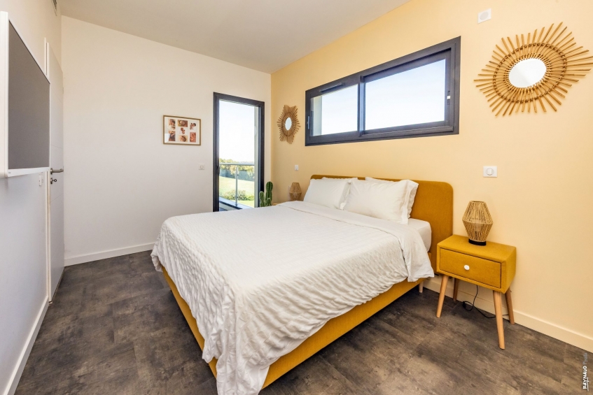 Chambre avec grande fenêtre toute hauteur, donnant sur le jardin.