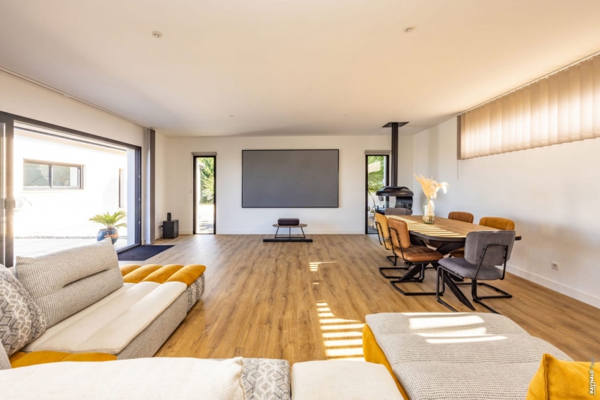 Sinon, en quelques mots, la maison est sur deux niveaux, la grande pièce de vie magnifique avec d'un côté la piscine de grande qualité et la partie salon, et de l'autre la chambre parentale (dressing, salle d'eau et terrasse) ainsi que des toilettes et le cellier.