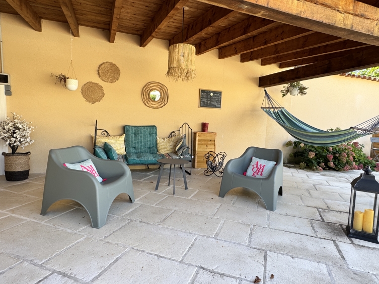 La terrasse de la piscine est immense, avec un haut mur d'un côté et la piscine d'eau salée (10 m x 5 m) de l'autre avec un bache de securité, ainsi qu'une grande terrasse couverte (16m2) offrant une vue magnifique sur la maison. La cellule d'electrolyse à été remplacé en 2024 aussi que le filtre de la piscine par un filtrage verre à la même temps.