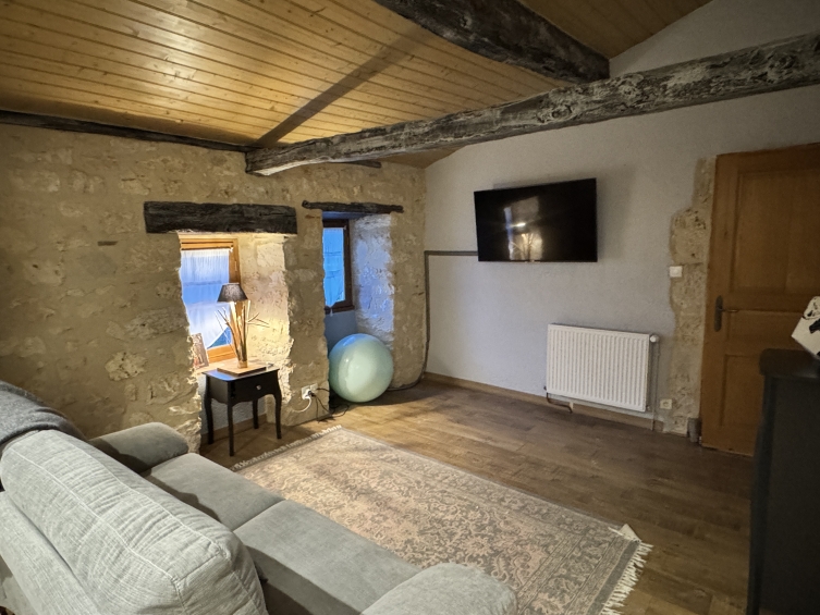 Le gîte attenant, en pierre, comprend, au rez de chaussée, une cuisine entièrement équipée (17m2) avec table set chaises, un salon (24m2) avec poêle à bois, porte fenêtres vers le terrasse. A l'étage, il y a deux chambres (19m2 et 13m2) et quelques éléments d'origine, notamment un ancien four et un évier (Ça devait être la cuisine d'origine) et un salle d'eau au milieu (5,5m2) avec douche et lavabos et un WC séparé.