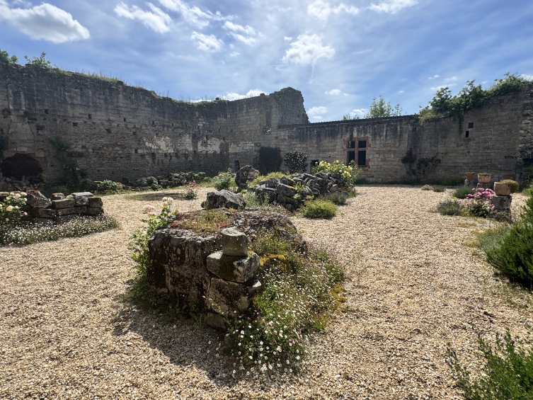LE CHÂTEAU Les vestiges du château, de la fin du 13ème ou du début du 14ème siècle, sont situés à côté des deux maisons. Deux impressionnantes portes en bois de chêne avec ferronnerie d'art donnent sur une grande cour centrale magnifiquement fleurie en été. Autour de la cour, les murs d'enceinte offrent un espace très privé avec plusieurs éléments historiques, notamment deux tours, une belle pièce voûtée dans lancien donjon, et un ancien logis partiellement restauré. Cest un régal pour les amateurs de vieilles pierres !