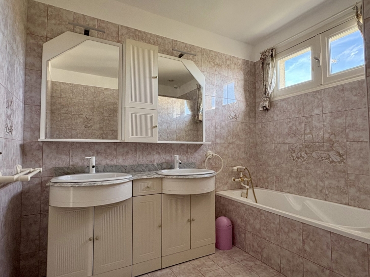 A l'étage, un grand palier, 4 chambres dont 3 avec petit placard, une salle de bains (baignoire, douche, double vasque) et un WC séparé. A l'extérieur, un garage, 3 places de stationnement et un petit jardin.