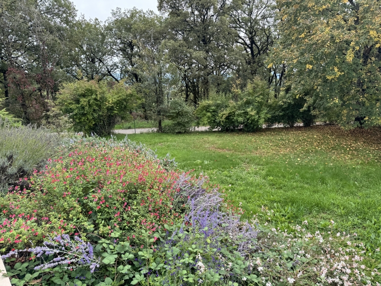 Dans le jardin, on trouve plusieurs arbres matures, dont un grand noyer, des terrasses, des pelouses, des bordures d'arbustes, de nombreuses places de parking et ces vues.