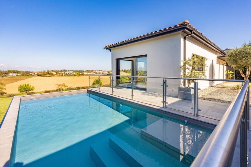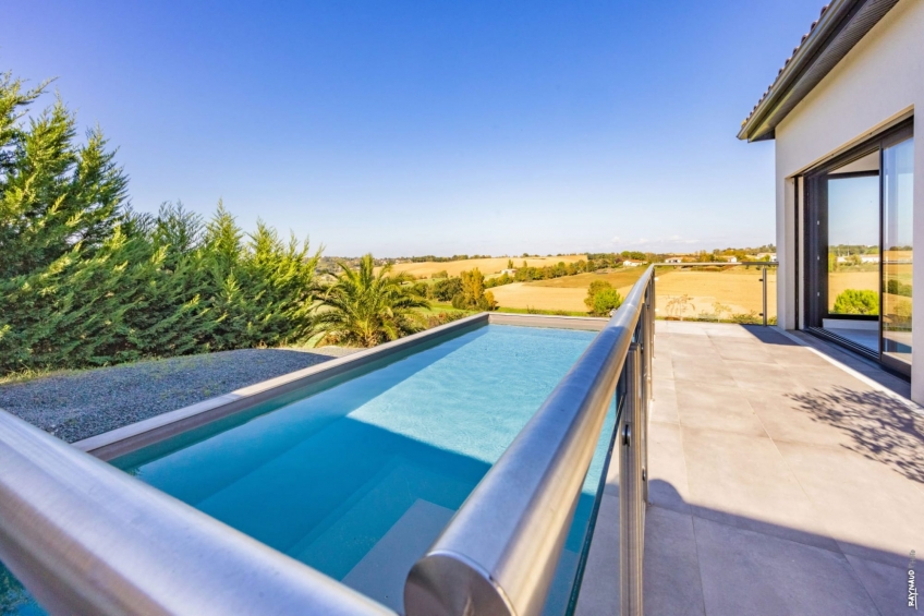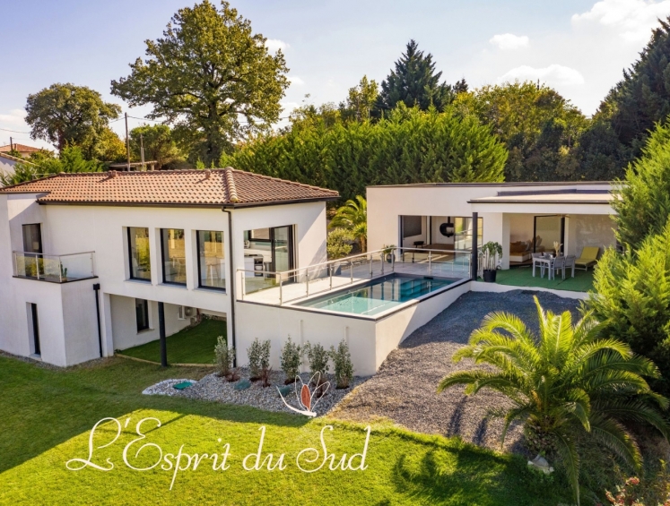 Dans les environs de Montastruc la Conseillère, une maison, que dis-je, un ensemble immobilier contemporain en position dominante avec vue imprenable sur la vallée et plus loin les coteaux, les villages alentour.