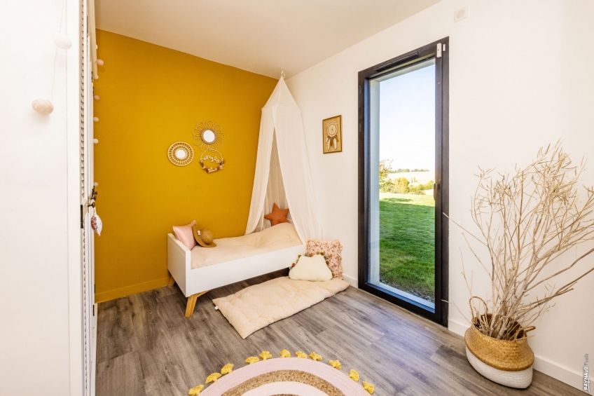 Chambre avec grande fenêtre toute hauteur, donnant sur le jardin.