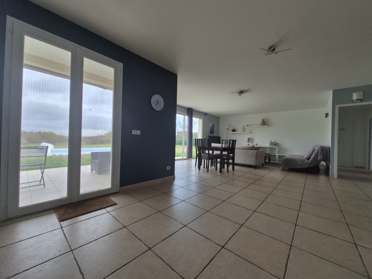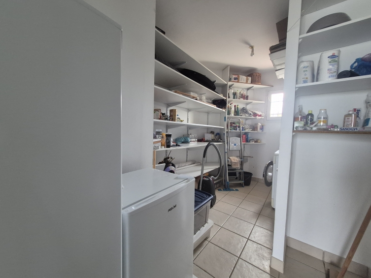 Le séjour est lumineux grâce à ses grandes ouvertures, la cuisine en prolongement est aménagée et équipée, l'ensemble représente un bel espace parfait pour les repas en famille ou les soirées entre amis. Un grand cellier/buanderie avec accès direct au garage complète cette partie de la maison.