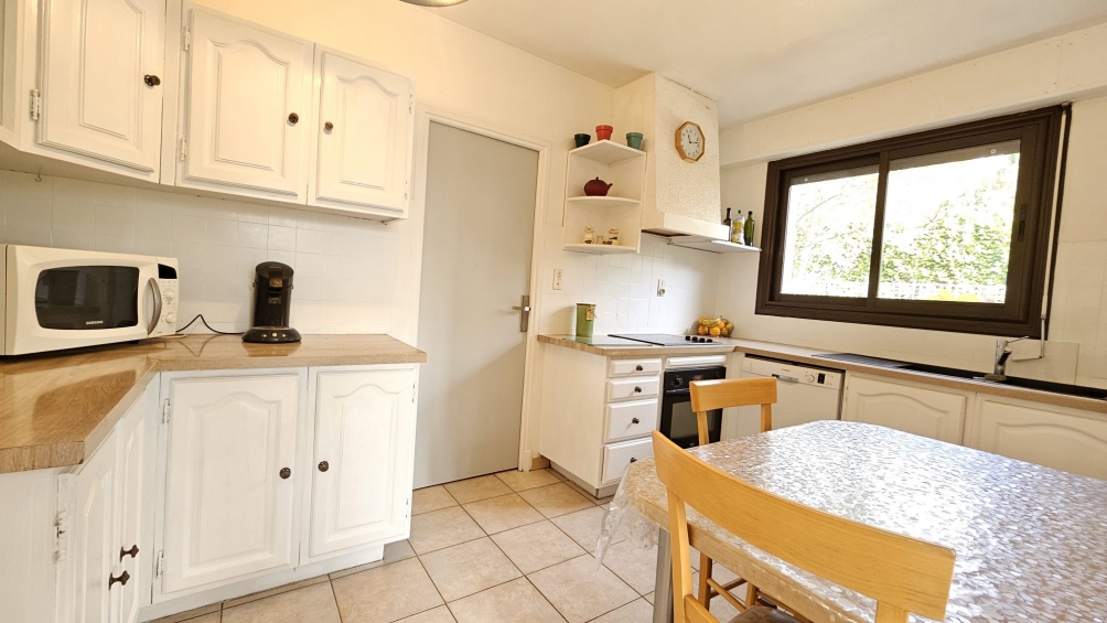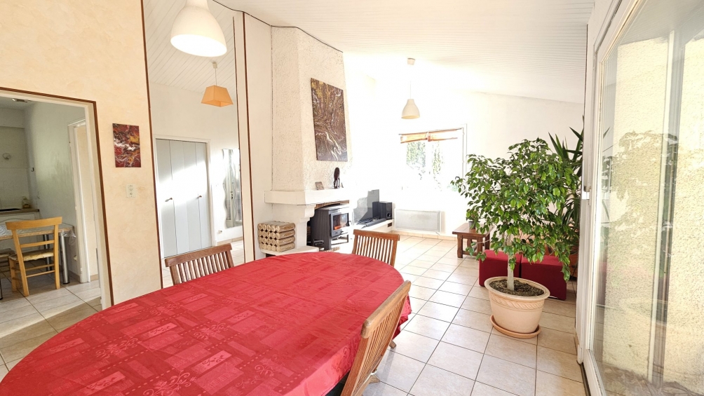 Vous entrerez par un couloir, généreux qui dispose de placards. En face une jolie cuisine, très bien aménagée. A gauche, la salle à manger et devant la cheminée avec poêle installé, le salon. Vous serez sans doute charmés par la luminosité de cet espace, ouvert sur la terrasse.